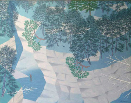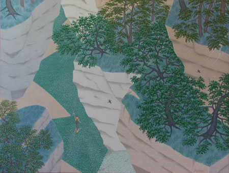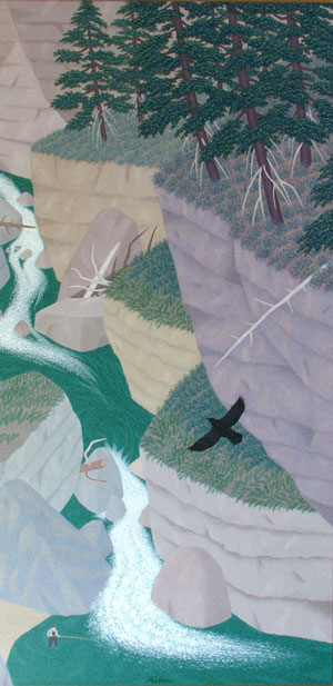 For Michener, his recent paintings are both a means of recapturing the experience of being a young man, and acting out an ageless ritual of engaging with the land and wildness. In all his landscapes, the fisher (and sometimes bather) is made minute within the grandeur of the cliffs and river banks. The planes of colour Michener fashions to create the land and the dappled patterns of vegetation envelope the figure. Although the landscapes are, in the end, inventions of Michener's imagination, they are made to represent both the difficulty of accessing nature and the healing, supportive environment that it offers.
